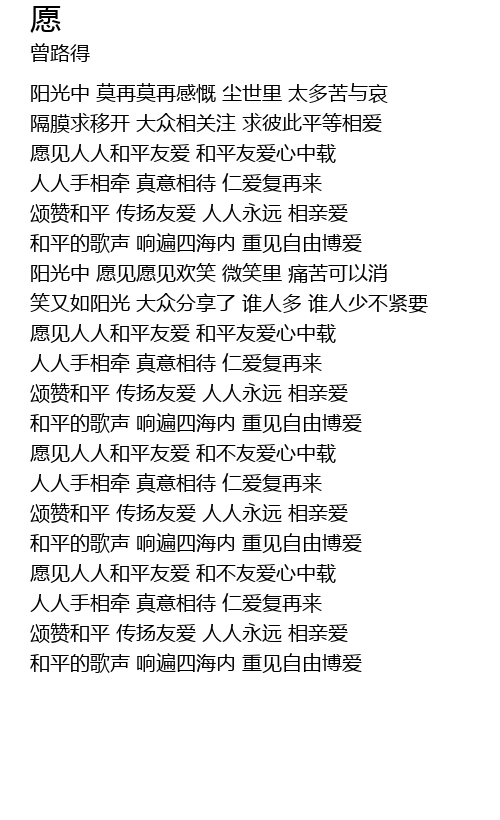 | [01:36.57] | 愿见人人和平友爱 和平友爱心中载 |