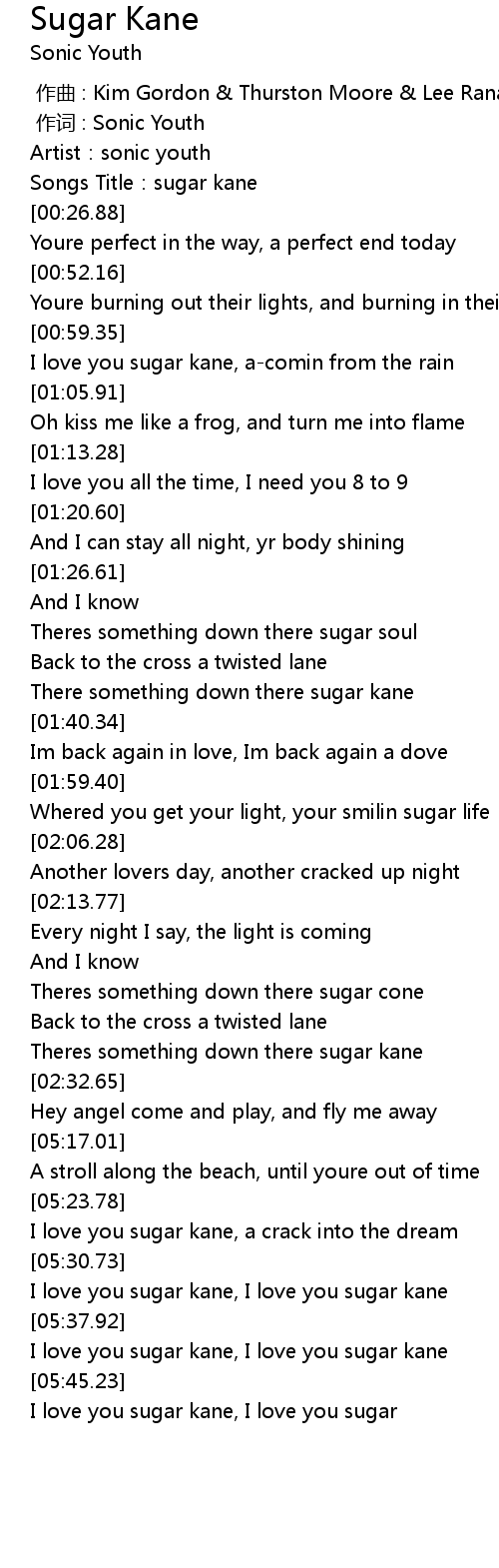 | [05:31.86] | I love you sugar kane, I love you sugar kane |