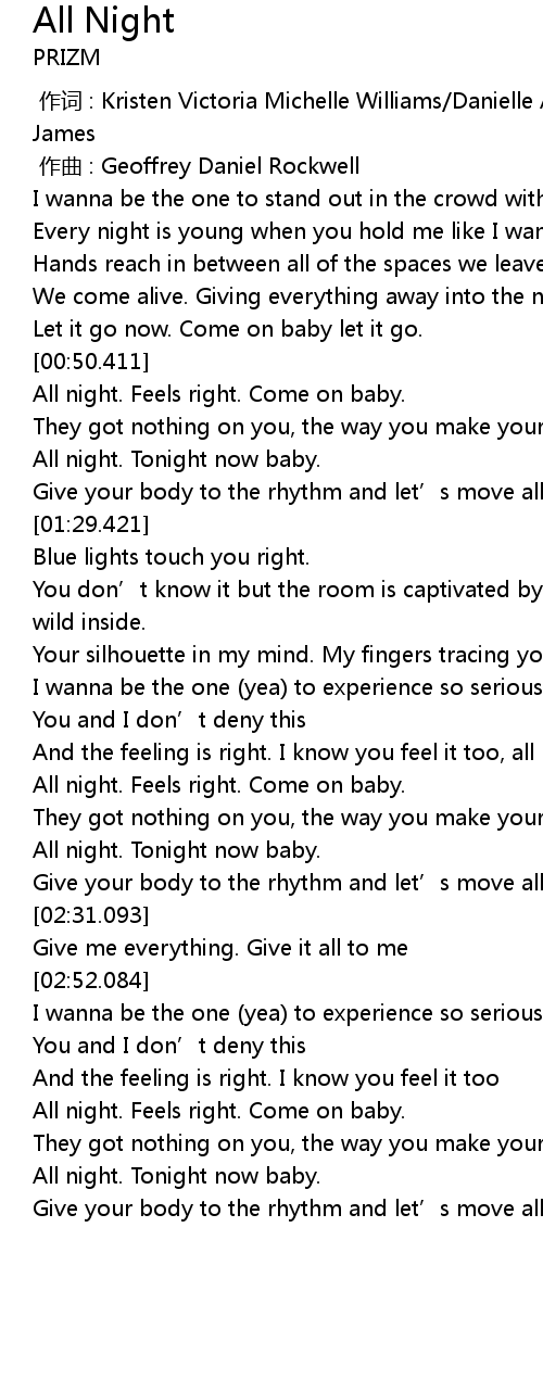 | [02:22.583] | Give your body to the rhythm and let' s move all night |