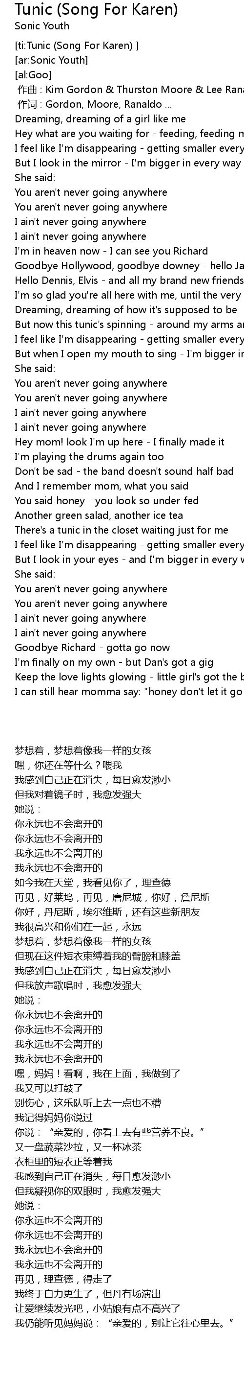 | [00:00.00] | zuo qu : Kim Gordon Thurston Moore Lee Ranaldo Steve Shelley |