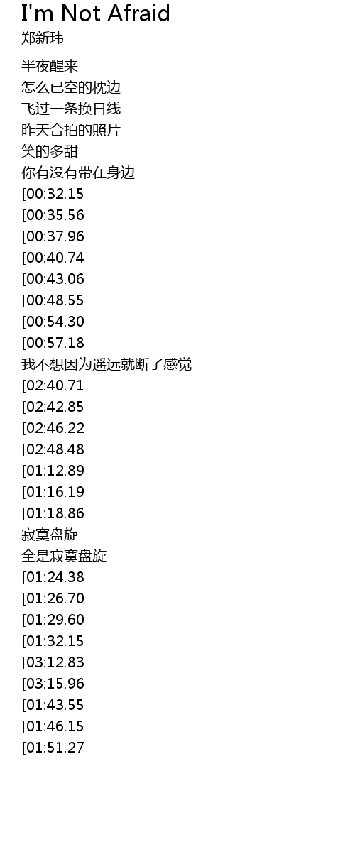 | [03:37.76][03:15.96][01:37.76] | I'm not afraid |