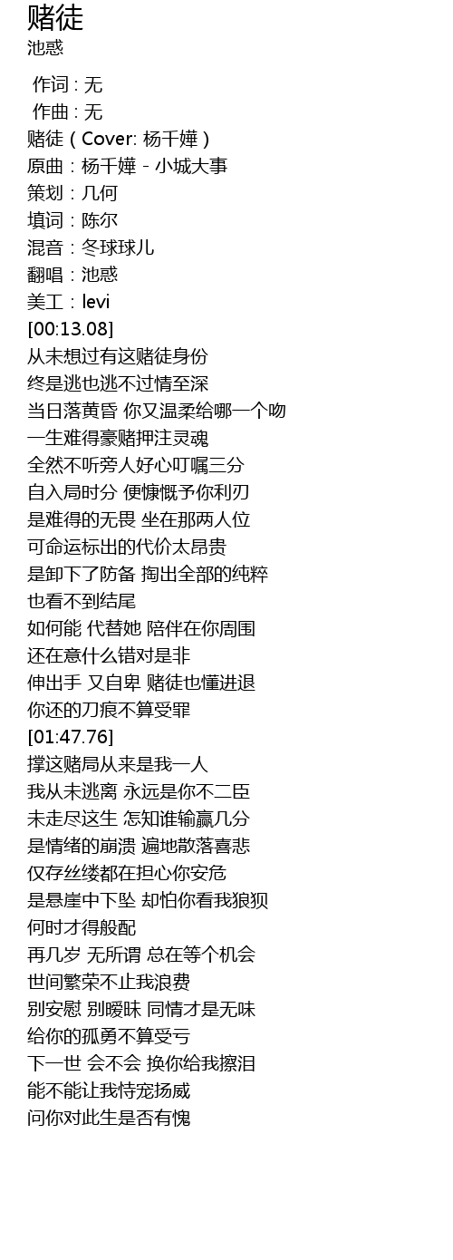 | [00:00.45] | 赌徒(Cover: 杨千嬅) |