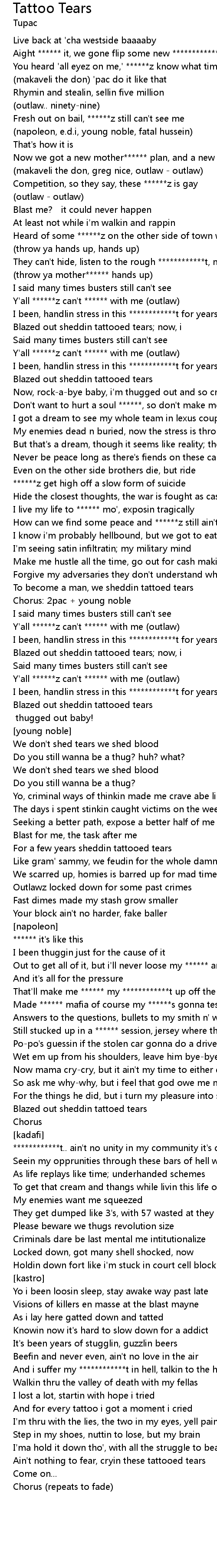 | Blazed out sheddin tattooed tears now, i | |