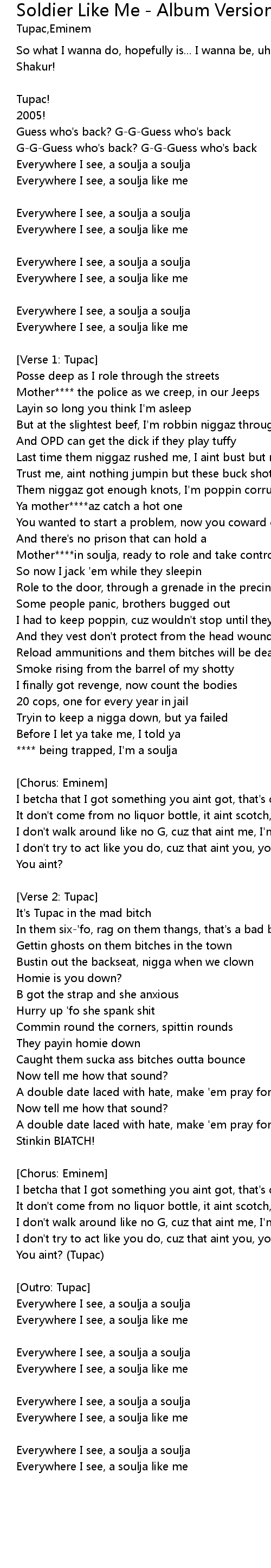 | Everywhere I see, a soulja like me | |