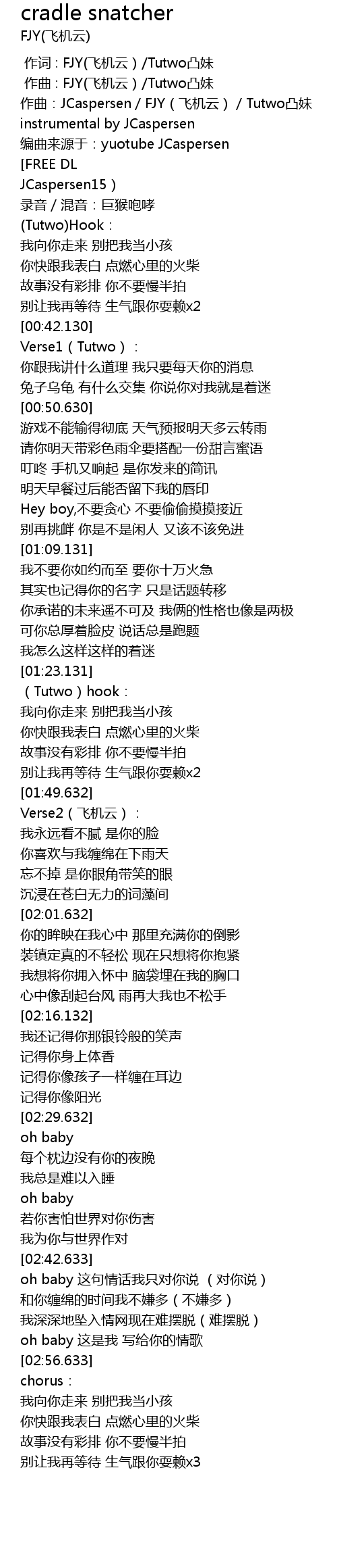 | [00:00.000] | 作词 : FJY(飞机云)/Tutwo凸妹 |