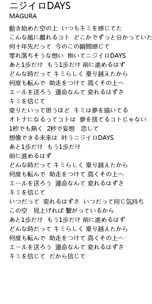 | [00:39.94] | 零れ落ちそうな想い 抱いてニジイロDAYS |