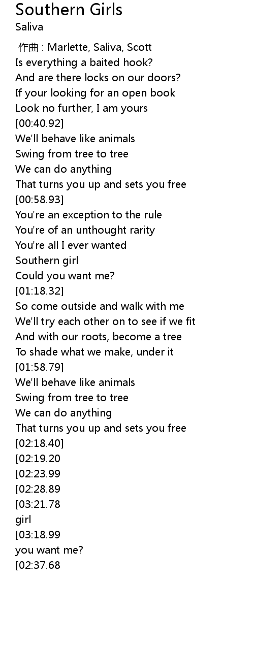 | [03:26.78][03:21.78][03:16.68][03:11.89][03:07.21][03:02.60][02:57.42][02:52.29][02:32.86] | Southern girl |