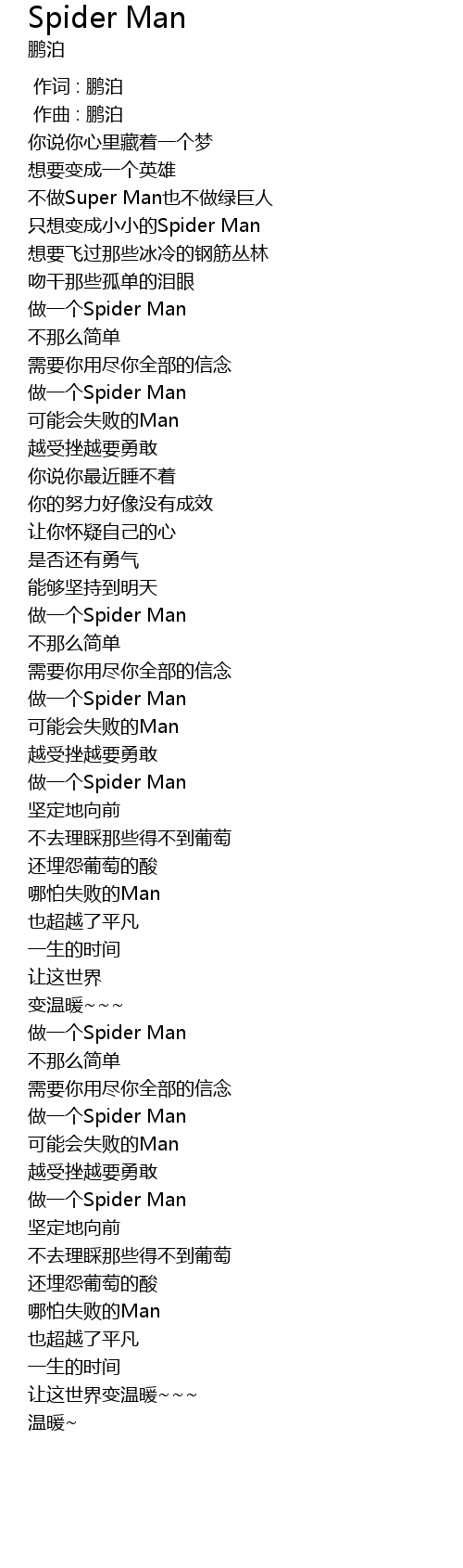| [00:28.49] | zhǐ xiǎng biàn chéng xiǎo xiǎo de Spider Man |