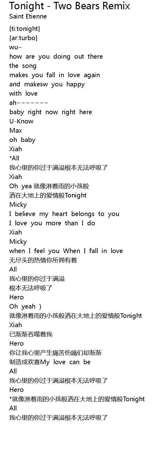 | [02:15.435] | jiù xiàng lín zhe yǔ de xiǎo hái bān sǎ zài dà dì shàng de ài qíng bān Tonight |