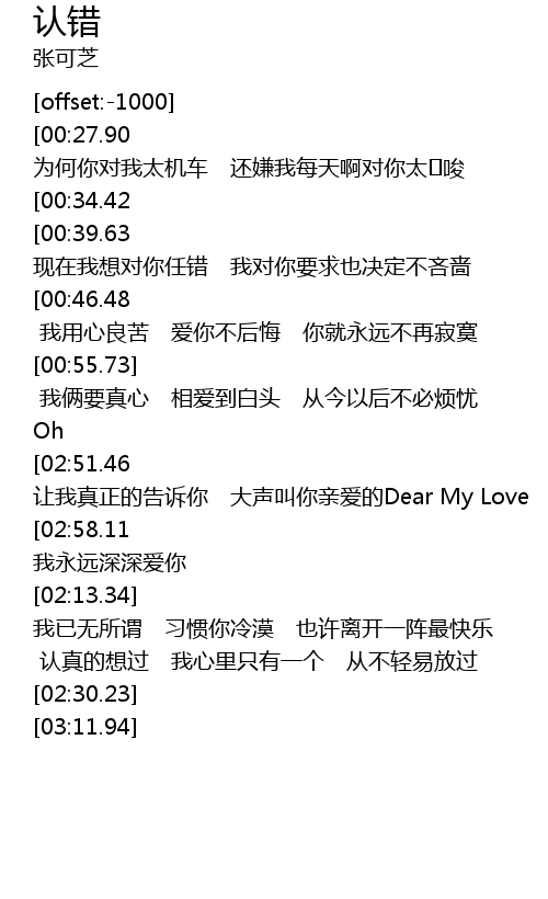 | [02:03.01][00:39.63] | xiàn zài wǒ xiǎng duì nǐ rèn cuò wǒ duì nǐ yāo qiú yě jué dìng bù lìn sè |