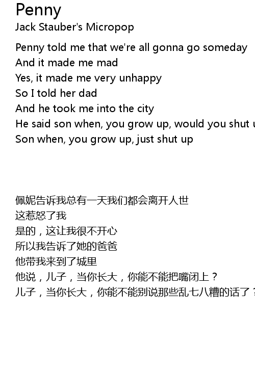 | [00:00.100] | 佩妮告诉我总有一天我们都会离开人世 |
