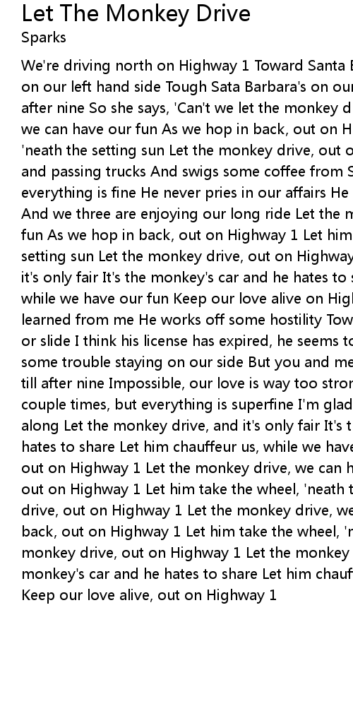 We're driving north on Highway 1 Toward Santa Barbara, lots of sun Pacific Ocean on our left hand side Tough Sata Barbara's on our mind, our love can't wait till after nine So she says, 'Can't we let the monkey drive?' Let the monkey drive, we can have our fun As we hop in back, out on Highway 1 Let him take the wheel, 'neath the setting sun Let the monkey drive, out on Highway 1 He's passing cars and passing trucks And swigs some coffee from Starbucks And in the backseat everything is fine He never pries in our affairs He never listens, never stares And we three are enjoying our long ride Let the monkey drive, we can have our fun As we hop in back, out on Highway 1 Let him take the wheel, 'neath the setting sun Let the monkey drive, out on Highway 1 Let the monkey drive, and it's only fair It's the monkey's car and he hates to share Let him chauffeur us, while we have our fun Keep our love alive on Highway 1 With obscene gestures, learned from me He works off some hostility Toward drivers who might cut him off or slide I think his license has expired, he seems to be a little wired He has some trouble staying on our side But you and me are doing fine We couldn't wait till after nine Impossible, our love is way too strong He hits the brakes a couple times, but everything is superfine I'm glad the monkey asked to come along Let the monkey drive, and it's only fair It's the monkey's car and he hates to share Let him chauffeur us, while we have our fun Keep our love alive, out on Highway 1 Let the monkey drive, we can have our fun As we hop in back, out on Highway 1 Let him take the wheel, 'neath the setting sun Let the monkey drive, out on Highway 1 Let the monkey drive, we can have our fun As we hop in back, out on Highway 1 Let him take the wheel, 'neath the setting sun Let the monkey drive, out on Highway 1 Let the monkey drive, and it's only fair It's the monkey's car and he hates to share Let him chauffeur us, while we have our fun Keep our love alive, out on Highway 1 |