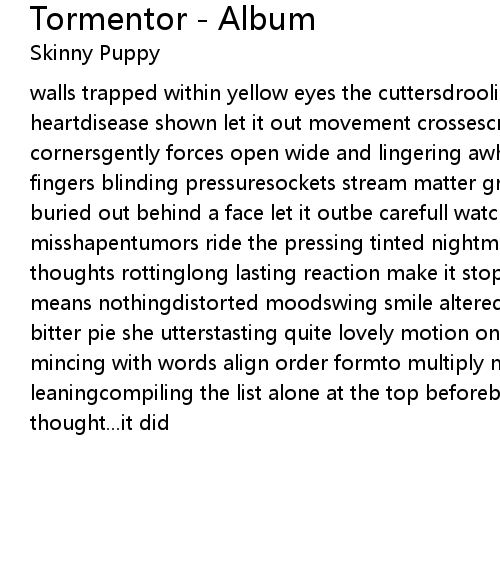 walls trapped within yellow eyes the cuttersdrooling face rips apart cuts to the heartdisease shown let it out movement crossescrimson light washes darkened cornersgently forces open wide and lingering awhilepouring thoughts electric fingers blinding pressuresockets stream matter grey the nerve free fallsafely buried out behind a face let it outbe carefull watching living mask misshapentumors ride the pressing tinted nightmare breezemental shock disturbed thoughts rottinglong lasting reaction make it stop stir up thepot taking away means nothingdistorted moodswing smile altered music shadowcovers melted honey bitter pie she utterstasting quite lovely motion on towards a truthfulstate mincing with words align order formto multiply mental shock relentless and leaningcompiling the list alone at the top beforebefore it was not this way i thought...it did |