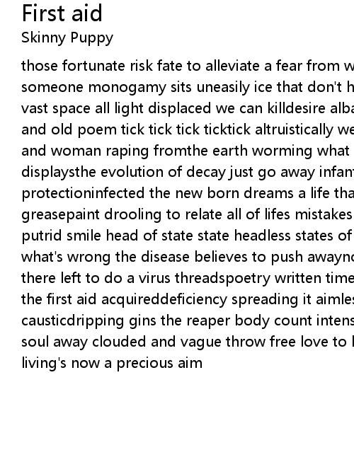 those fortunate risk fate to alleviate a fear from withinclawing to trust someone monogamy sits uneasily ice that don't heatfreeze howl hollow howl in vast space all light displaced we can killdesire albatross worn subvert to twist and old poem tick tick tick ticktick altruistically we've come a long way man and woman raping fromthe earth worming what it's worth right wing ricochet displaysthe evolution of decay just go away infant hospital winged protectioninfected the new born dreams a life that cannot be intuitive greasepaint drooling to relate all of lifes mistakes hitting in the faceorchard putrid smile head of state state headless states of being asright up against what's wrong the disease believes to push awaynormality alone with virtue what's there left to do a virus threadspoetry written time dogmatically lifes plague the first aid acquireddeficiency spreading it aimlessly have heart crash course causticdripping gins the reaper body count intensify getting weaker moistenthe soul away clouded and vague throw free love to history masters ofnothing living's now a precious aim