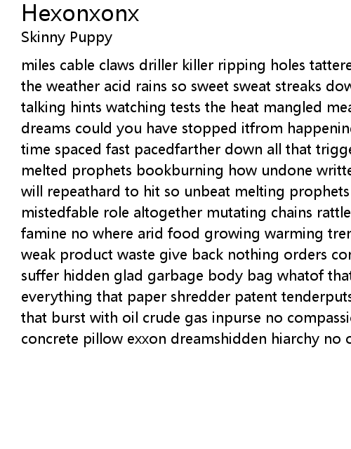 miles cable claws driller killer ripping holes tattered cloth stainedregaining the weather acid rains so sweet sweat streaks downpouron humidity colder time talking hints watching tests the heat mangled meatretaliate no blaming in future dreams could you have stopped itfrom happening best left spectator spectacle time spaced fast pacedfarther down all that trigger guaging cause kills at will melted prophets bookburning how undone written slurs the meaning the past they will repeathard to hit so unbeat melting prophets the past melting undone mistedfable role altogether mutating chains rattle happy to perform eitherwar or famine no where arid food growing warming trends a place passivecows to feed the weak product waste give back nothing orders come inmake a million living things suffer hidden glad garbage body bag whatof that change that could save everything that paper shredder patent tenderputs us back in time again budgets that burst with oil crude gas inpurse no compassion common criminals seek asylum concrete pillow exxon dreamshidden hiarchy no one in power taking blame