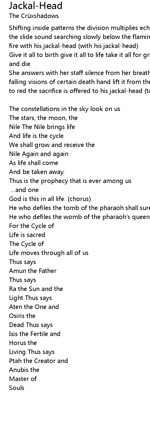 She answers with her staff silence from her breath silhouettes of temples falling visions of certain death hand lift it from the pocket the prophet falls to red the sacrifice is offered to his jackal-head (to his jackal-head) (chorus) [transcribed] |
