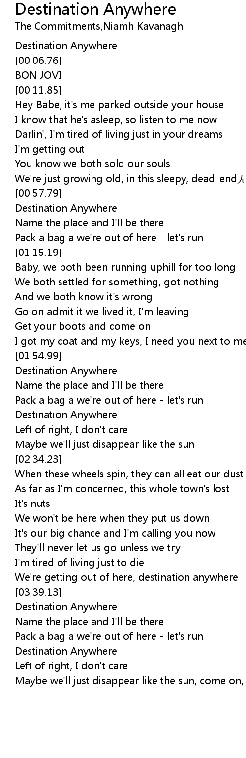 | [03:36.83] | We' re getting out of here, destination anywhere |