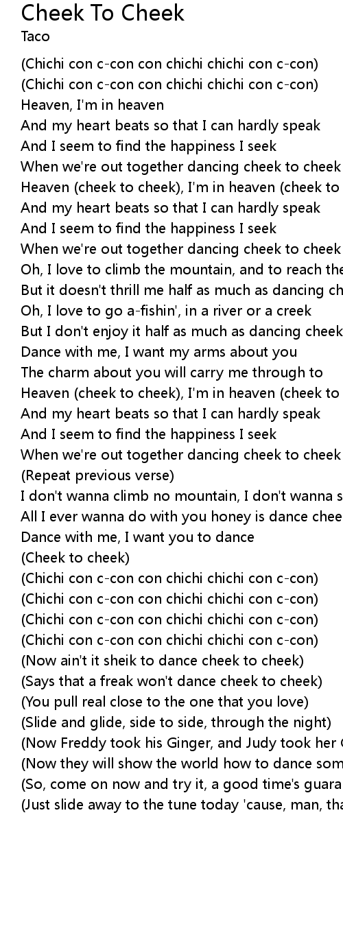 Heaven (cheek to cheek), I'm in heaven (cheek to cheek) |