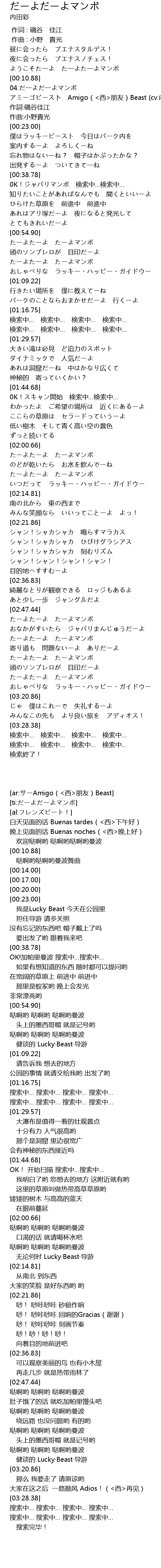 | [00:14.00] | アミーゴビース卜 Amigo(<西>朋友)Beast (cv.内田彩) |