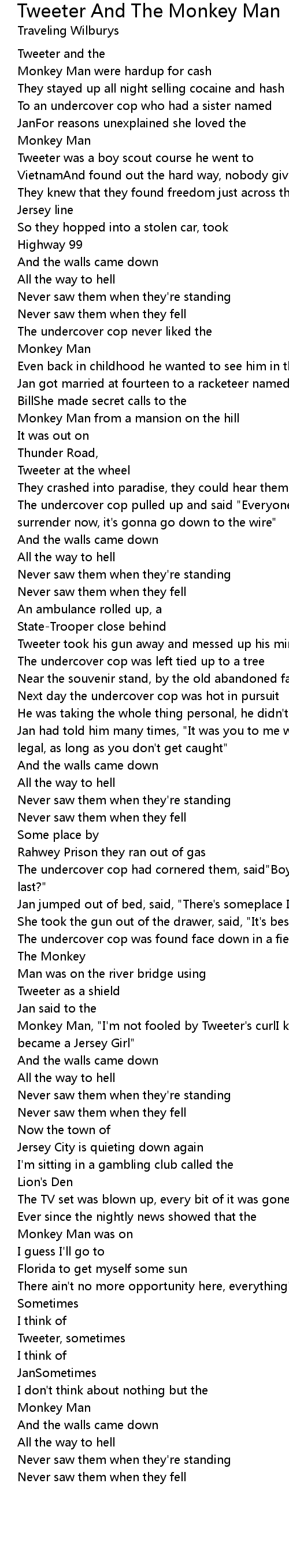Monkey Man, "I'm not fooled by Tweeter's curlI knew him long before he ever became a Jersey Girl" |