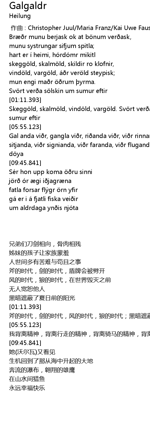 | [07:12.156] | Gal anda vi r, gangla vi r, ri anda vi r, vi r rinnanda, vi r sitjanda, vi r signianda, vi r faranda, vi r fluganda, skal alta fyrna ok um d ya |