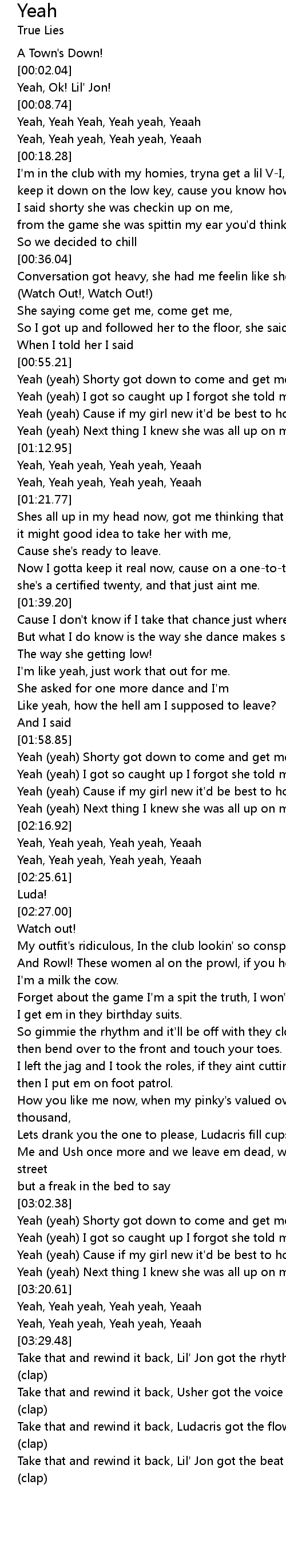Take that and rewind it back, Lil' Jon got the rhythm make ya booty go (clap) |