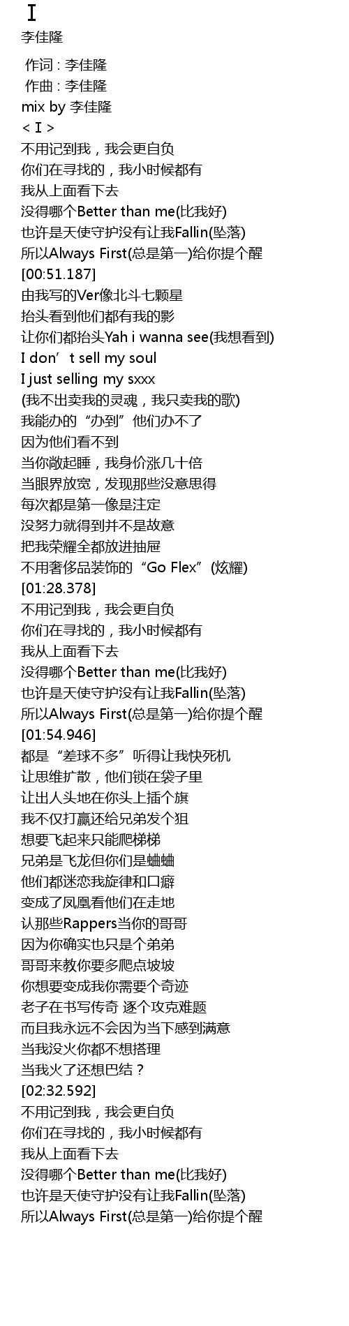 | [01:53.752] | suo yi Always First zong shi di yi gei ni ti ge xing |