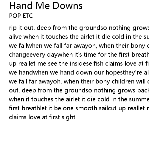 | rip it out, deep from the groundso nothing grows back in its placedon't keep it alive when it touches the airlet it die cold in the summer daywhen we fallwhen we fallwhen we fall far awayoh, when their bony children will cause seasons to changeevery daywhen it's time for the first breathlet it be one smooth sailcut up reallet me see the insideselfish claims love at first sightwhen we handwhen we handwhen we hand down our hopesthey're all alonewhen we fallwhen we fallwhen we fall far awayoh, when their bony children will cause seasons to changerip it out, deep from the groundso nothing grows back in its placedon't keep it alive when it touches the airlet it die cold in the summer daywhen it's time for the first breathlet it be one smooth sailcut up reallet me see the insideselfish claims love at first sight |