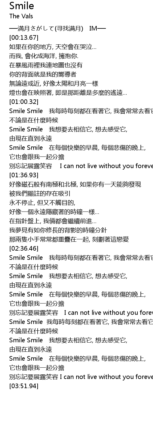 | [03:21.13] | Smile Smile 我想要去相信它, 想去感受它, 由現在直到永遠 |