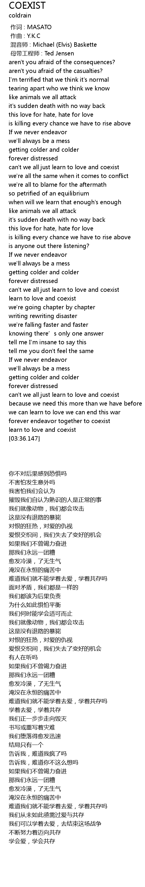 | [03:02.643] | 难道我们就不能学着去爱,学着共存吗 |