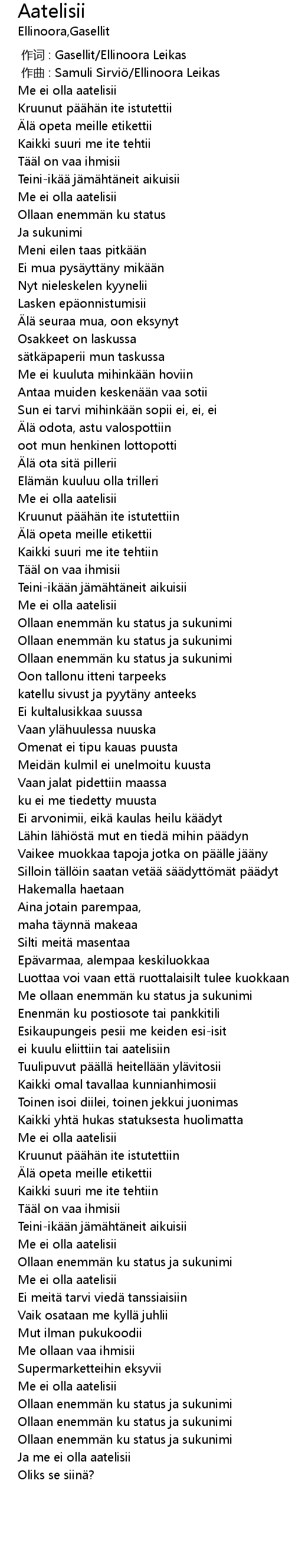 | [00:00.00] | 作词 : Gasellit/Ellinoora Leikas |