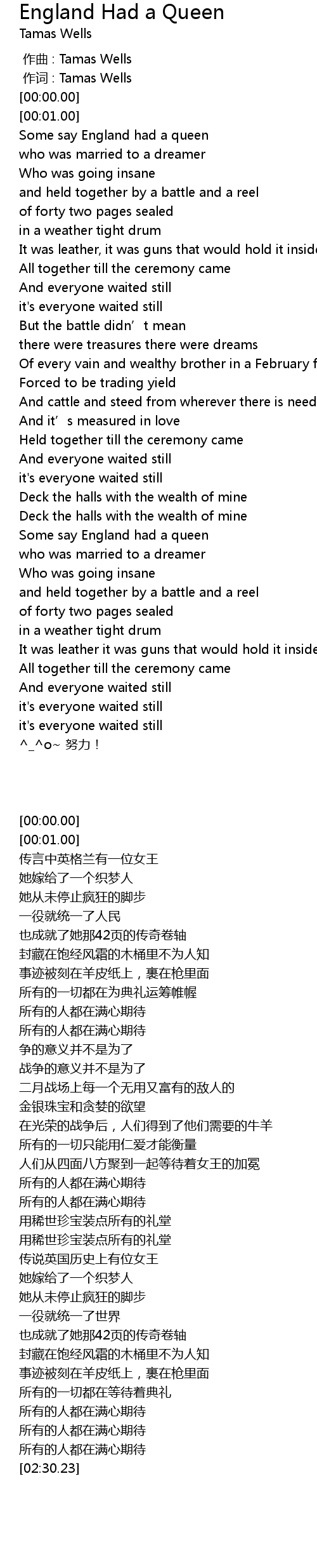 | [00:03.42] | 传言中英格兰有一位女王 |