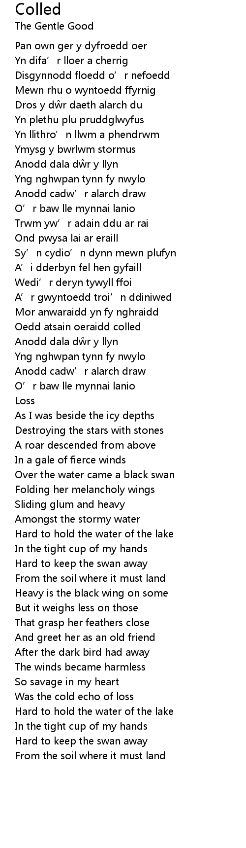 | Dros y dŵr daeth alarch du | |