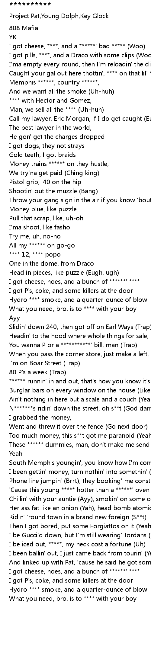 I got cheese, ****, and a ******' bad ***** (Woo) |