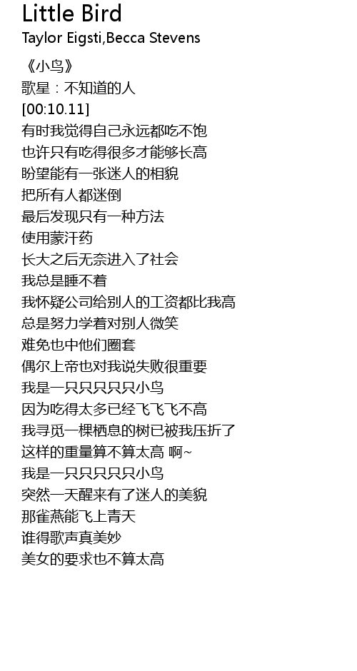 | [01:54.11] | 我是一只只只只只小鸟 |