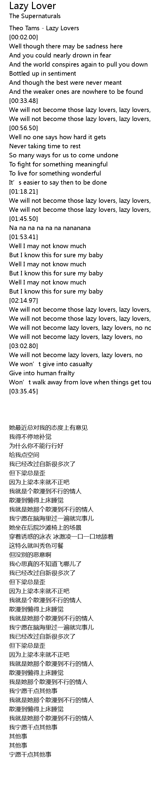 | [02:38.92] | We will not become lazy lovers, lazy lovers, no no no |