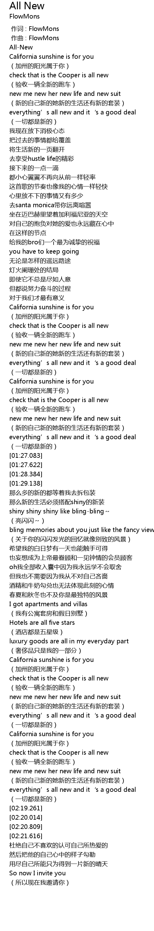 | [02:05.399] | xīn de zì jǐ xīn de tā xīn de shēng huó hái yǒu xīn de tào zhuāng |