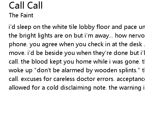 i'd sleep on the white tile lobby floor and pace until the time to visit starts. the bright lights are on but i'm away... how nervous a voice sounds on the phone. you agree when you check in at the desk . permission and trust in every move. i'd be beside you when they're done but i'll have to wait until i can call. the blood kept you home while i was gone. they left you a note when you woke up "don't be alarmed by wooden splints." there won't be a need for you to call. excuses for careless doctor errors. acceptance by all past patients have allowed for a cold disclaiming note. the warning is there, no need to call.