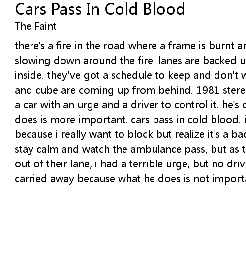 there's a fire in the road where a frame is burnt and other automobiles are slowing down around the fire. lanes are backed up and people get all anxious inside. they've got a schedule to keep and don't want life to slip by. the siren and cube are coming up from behind. 1981 stereo is drowned from the sound. i see a car with an urge and a driver to control it. he's carried away because what he does is more important. cars pass in cold blood. i hold back, it's hard to; because i really want to block but realize it's a bad time for that. i try to stay calm and watch the ambulance pass, but as the car with the schedule pulled out of their lane, i had a terrible urge, but no driver to control it. don't get carried away because what he does is not important.