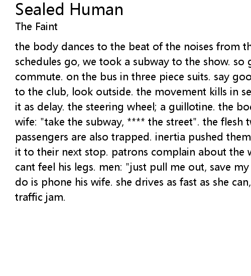 the body dances to the beat of the noises from the street. as patterns grids and schedules go, we took a subway to the show. so give us this day our daily commute. on the bus in three piece suits. say goodbye, kiss and ride. on the way to the club, look outside. the movement kills in several ways, although we see it as delay. the steering wheel; a guillotine. the body dances to the beat. wife: "take the subway, **** the street". the flesh twists between the gap and passengers are also trapped. inertia pushed them all along, but they wont make it to their next stop. patrons complain about the wait, while the man outside cant feel his legs. men: "just pull me out, save my life" but all the cops can do is phone his wife. she drives as fast as she can, and gets caught up in a traffic jam. |