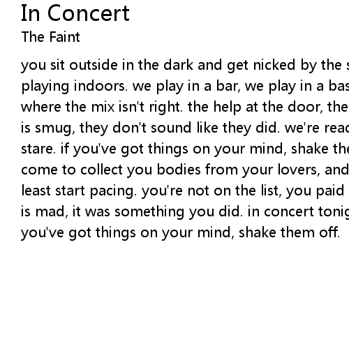 you sit outside in the dark and get nicked by the strobe light while we're playing indoors. we play in a bar, we play in a basement. we play in a room where the mix isn't right. the help at the door, the age to get in, the artist is smug, they don't sound like they did. we're ready to move, the crowd is a stare. if you've got things on your mind, shake them off. that's why we have come to collect you bodies from your lovers, and pause all the suffering... at least start pacing. you're not on the list, you paid to get in. your boyfriend is mad, it was something you did. in concert tonight, the bass drum is quick. if you've got things on your mind, shake them off. |