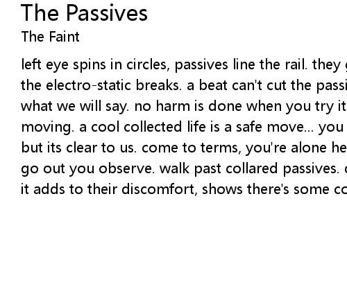 left eye spins in circles, passives line the rail. they get no satisfaction from the electro-static breaks. a beat can't cut the passives loose they're afraid what we will say. no harm is done when you try it then hide. parts moving - keep moving. a cool collected life is a safe move... you heard that. you're unsure but its clear to us. come to terms, you're alone here observing. every time you go out you observe. walk past collared passives. don't look toward their eyes. it adds to their discomfort, shows there's some confidence they miss. |