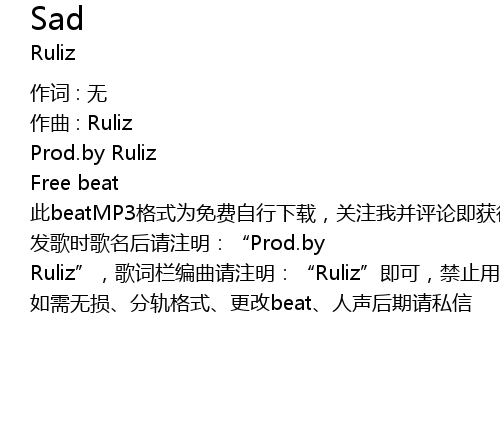 | 发歌时歌名后请注明:“Prod.by Ruliz”,歌词栏编曲请注明:“Ruliz”即可,禁止用于商业性质,尊重知识产权,侵权必究,谢谢。 | |
