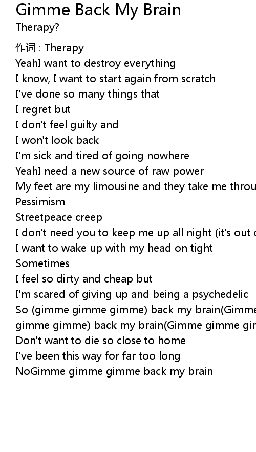 | So gimme gimme gimme back my brain Gimme gimme gimme back my brain Gimme gimme gimme back my brain Gimme gimme gimme back my brain | |