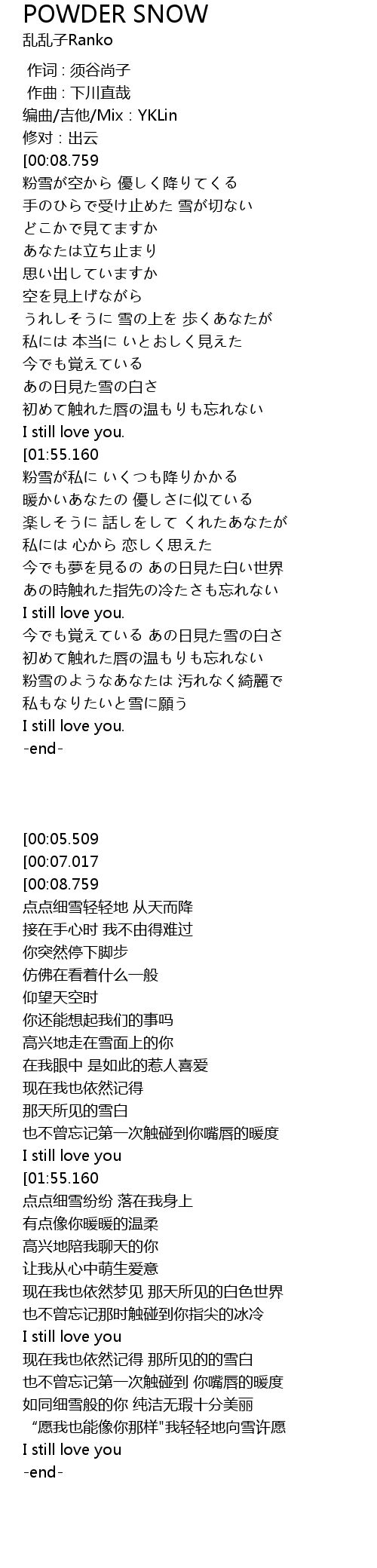 | [02:11.353] | 粉雪が私に いくつも降りかかる |