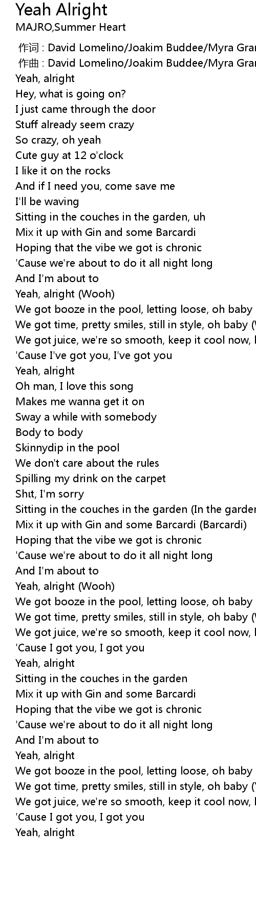 | [02:43.070] | We got booze in the pool, letting loose, oh baby Yeah, alright |