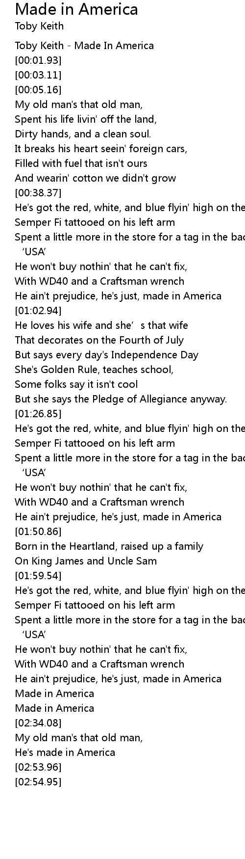 | [00:00.00] | Toby Keith - Made In America |