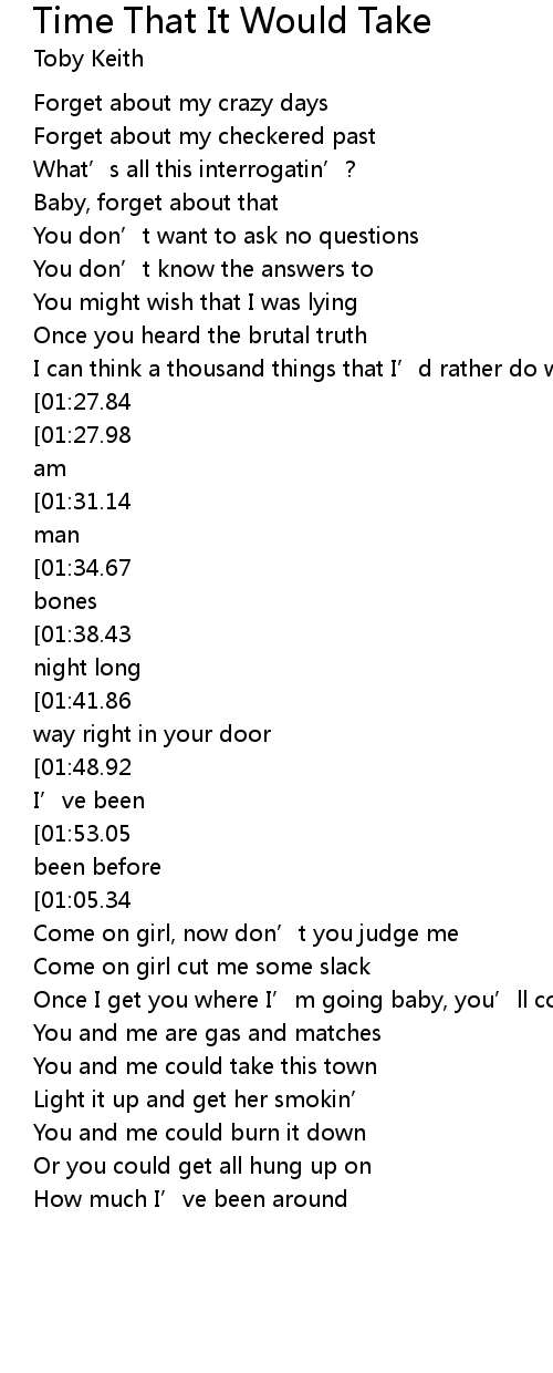 | [02:32.76][01:48.92][00:54.39] | But in the time it would take me to tell you where I’ve been |