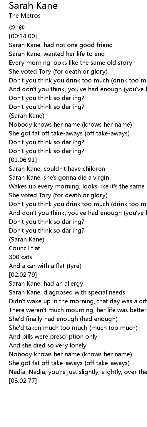 [01:15.96] Sarah Kane, she's gonna die a virgin