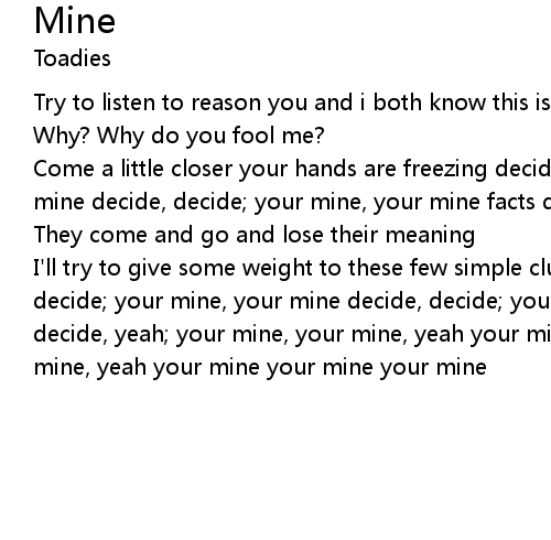 | I'll try to give some weight to these few simple clumsy words i say decide, decide; your mine, your mine decide, decide; your mine, your mine decide, decide, yeah; your mine, your mine, yeah your mine your mine your mine your mine, yeah your mine your mine your mine |